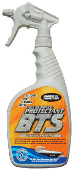 BTS Protectant's "spray and wipe" polymer technology leaves no chalky build-up unlike waxes and requires little labor to apply. BTS can be used to protect and beautify most surfaces including fiberglass, gelcoat, plastic, metal, carpet, leather, painted surfaces and wood and is ideal for keeping vinyl seats soft and supple for years.